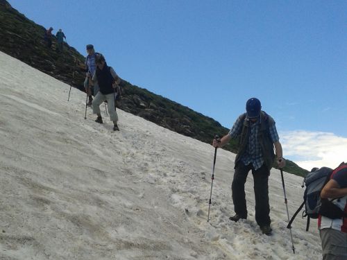 Dabei ist auch ein Schneefeld zu überwinden. Bald trennt sich der Weg und einige gehen ab hier den kürzeren Weg zurück.