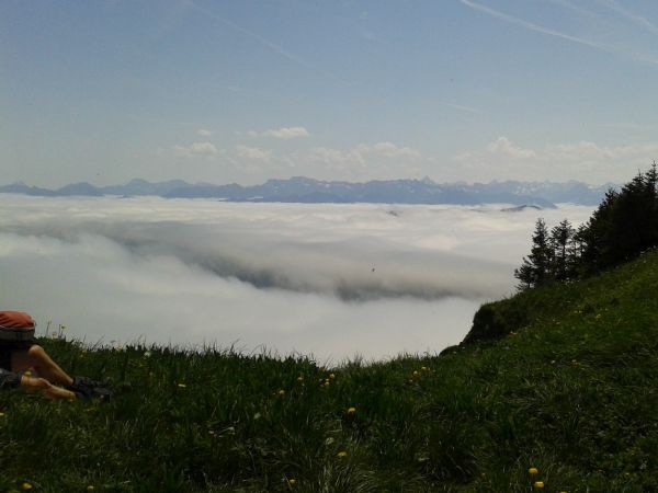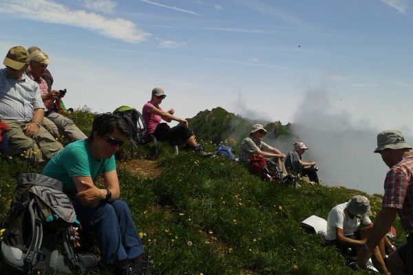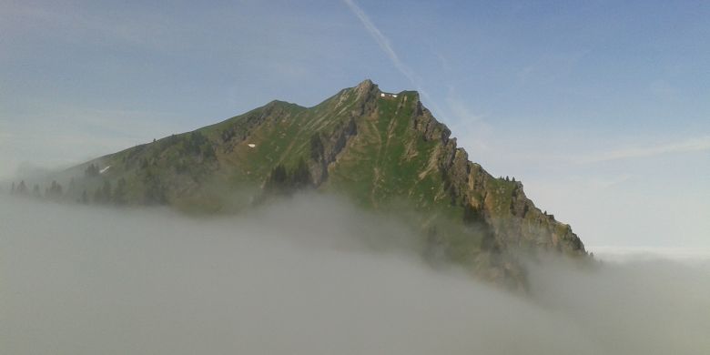 In Höhe der Gründlescharte erreichen wir die Nebelgrenze und es eröffnet sich ein herrlicher Blick auf das benachbarte Rindalphorn. Im weiteren Tourverlauf bleibt es sonnig und warm.