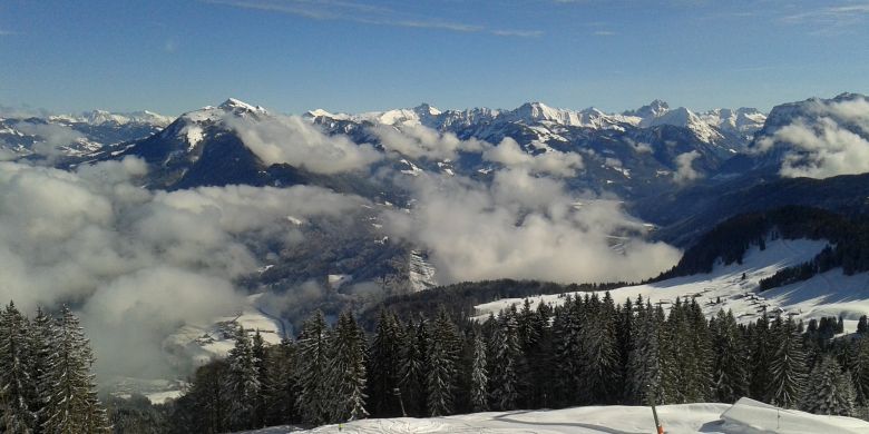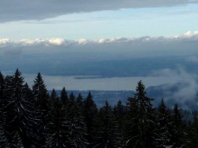 Vom Gipfel gibt es eine schöne Aussicht und ein Streifen Himmel zwischen Wolkendecke und verschneiter Erde leuchtet türkisblau.