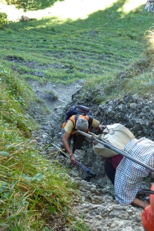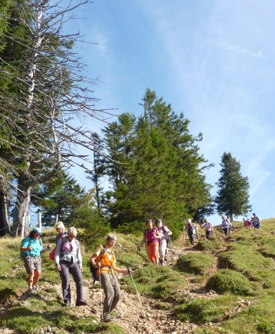 Da der Weg von Talstation-Bergbahn über die Brunnenauscharte aber auf dem Nagelfluhgestein sehr rutschig ist fahren alle mit der Bahn nach oben.