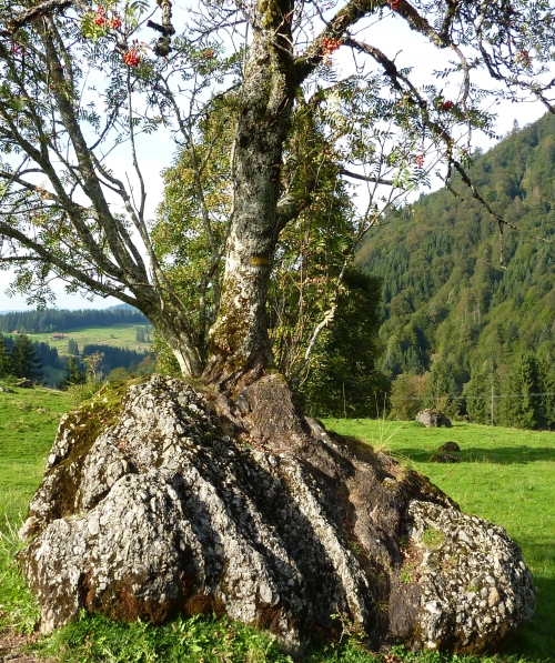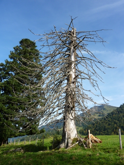 Von der Falkenhütte führt der Weg zwischen teils riesigen alten Bäumen (lt. Karte Bergahorn, Buche, Weisstanne, Fichte, Bergulme, Vogelkirsche und Eberesche) zurück zum Bus.