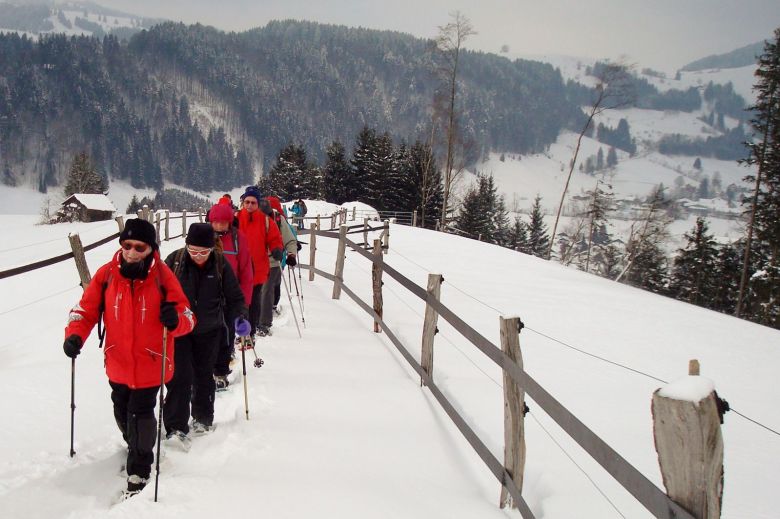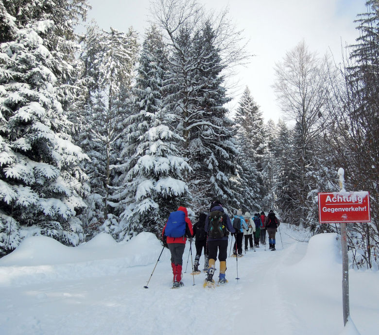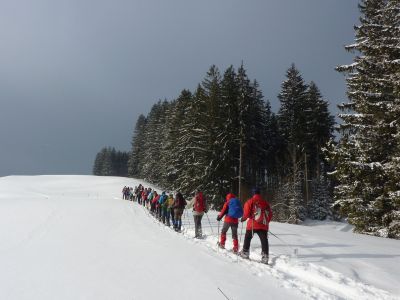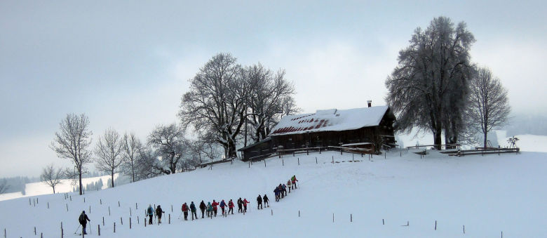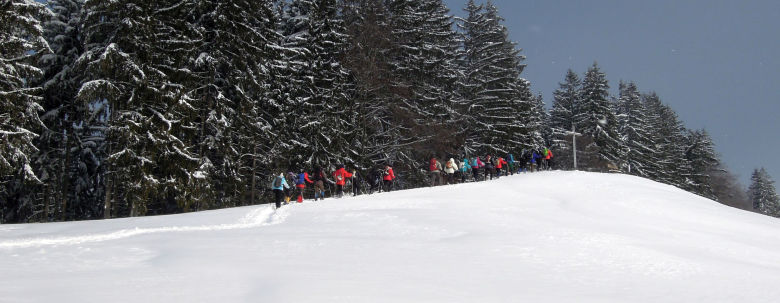 Wir parken mitten in Missen und gehen bereits ab Parkplatz mit angeschnallten Schneeschuhen. Noch im Ort fallen einzelne Schneeschuhe vom Trägerfuss. Nicht alle scheinen ausreichend vorbereitet.